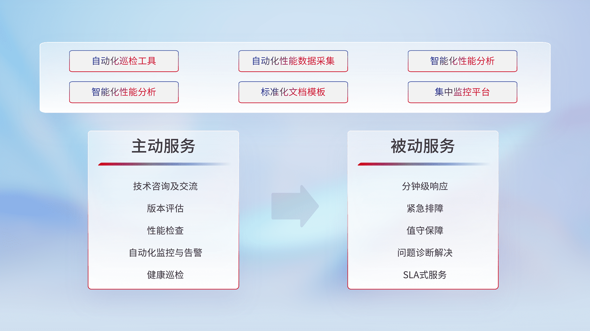 智能化工具和标准化文档,,保障服务质量,,,,提供主动服务(包含技术咨询、、版本评估、、、性能检查、、自动化监控与告警、、、健康巡检)和被动服务包含(分钟级响应、、紧急排障、、值守保障、、问题诊断解决、、、SLA服务)。。。。